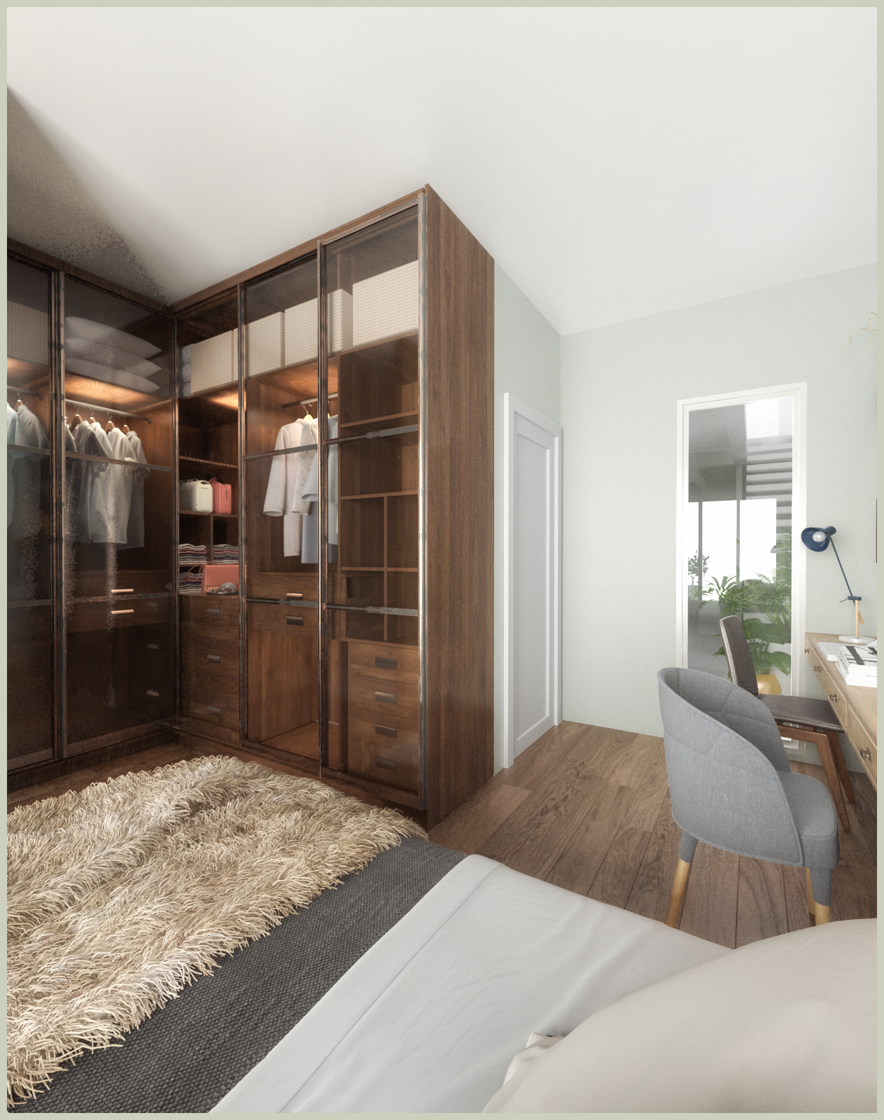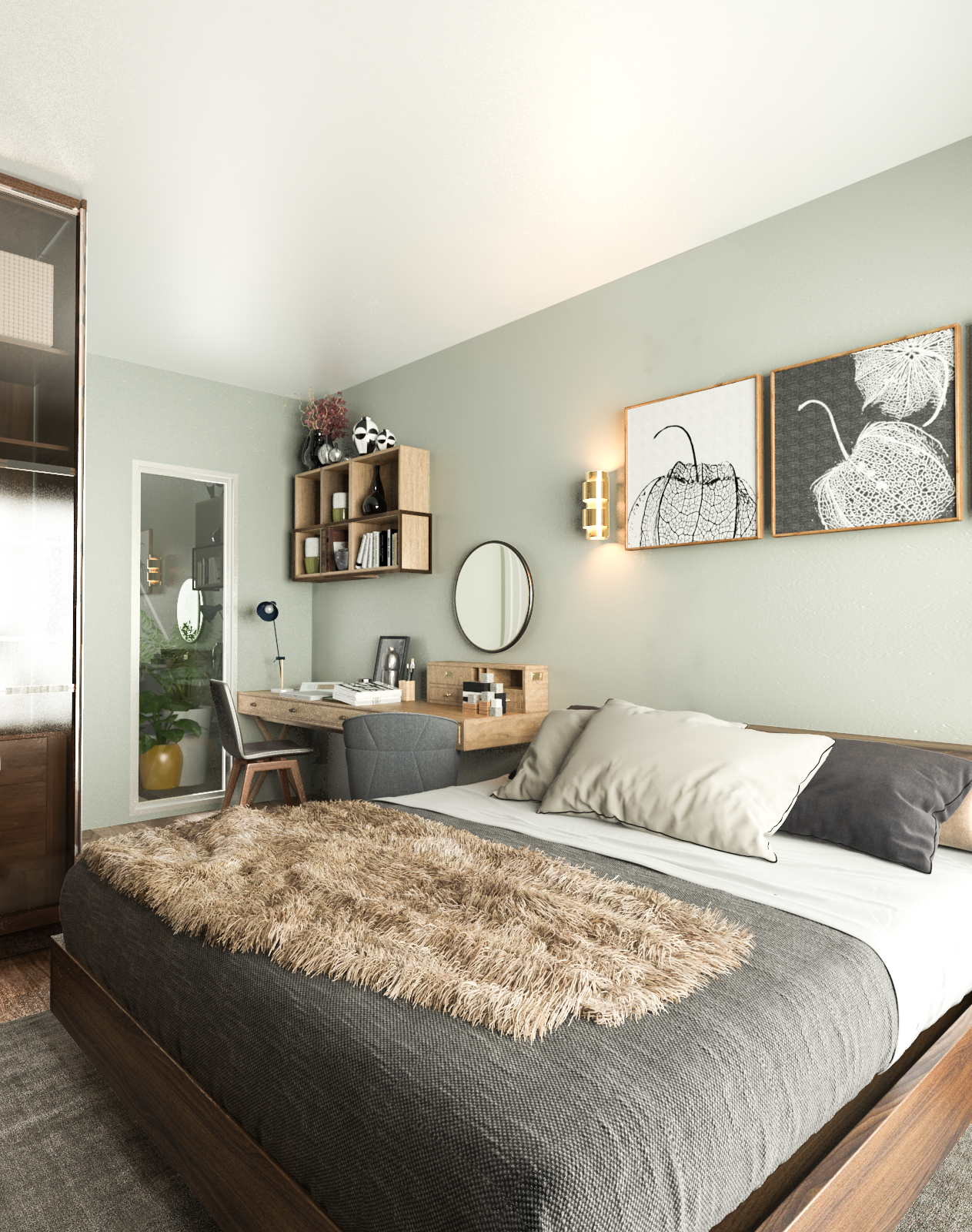 Phòng ngủ của đôi vợ chồng trẻ được cải tạo lại nội thất với gam màu trầm, cho cảm giác tĩnh tại và thư thái, nơi ta có thể dễ dàng chìm vào một giấc ngủ thật sâu và yên lành. Tủ áo với cánh kính nổi bật làm không gian trong góc phòng bừng sáng hơn với ánh sáng tự nhiên từ khoảnh sân sau phản chiếu vào.