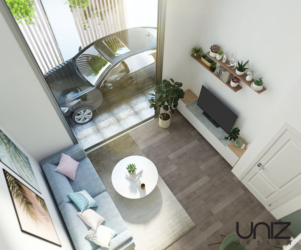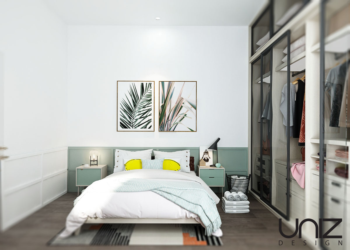 Mẫu thiết kế nội thất nhà ở phù hợp cho không gian đô thị chật hẹp. Thiết kế phù hợp với ngân sách vừa phải nhưng vẫn đảm bảo đầy đủ công năng sử dụng cho gia đình trẻ có từ 1 đến 2 bé. Phong cách thiết kế hướng đến sự tươi sáng và thanh thoát với màu trắng chủ đạo, điểm xuyết bởi gam màu pastel xanh mát cùng sàn gỗ tối màu.